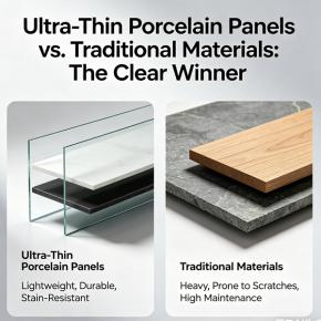 Ultra-thin porcelain panels (4.5mm) from China’s top manufacturer: 60% lighter, more durable, seamless—perfect for facades, furniture & high-end interiors.